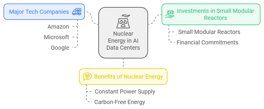 Major tech companies, including Amazon, Microsoft, and Google, are turning to nuclear energy to power their growing AI data centers. These companies are investing heavily in small modular reactors to provide constant, carbon-free power.